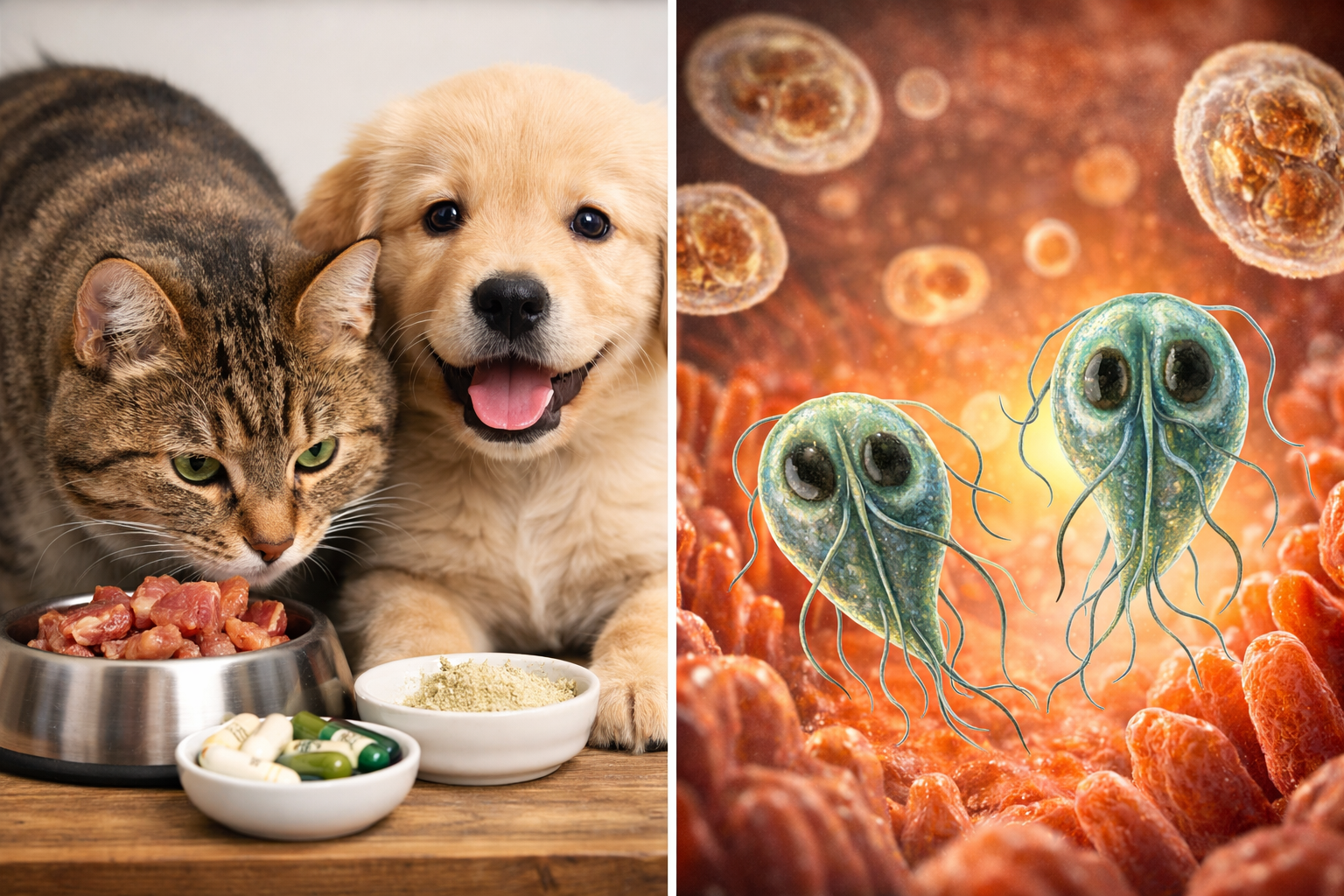 Giardia is een veelvoorkomende darmparasiet bij zowel honden als katten. Veel baasjes herkennen het probleem: na een behandeling bij de dierenarts verdwijnen de klachten tijdelijk, maar na verloop van tijd keert giardia weer terug. Dit kan zorgen voor aanhoudende diarree, een verminderde weerstand en een verstoorde darmgezondheid. In deze blog lees je wat giardia is, waarom een reguliere behandeling vaak niet voldoende is en hoe je giardia bij hond én kat van binnenuit aanpakt met voeding, supplementen en het versterken van de weerstand.