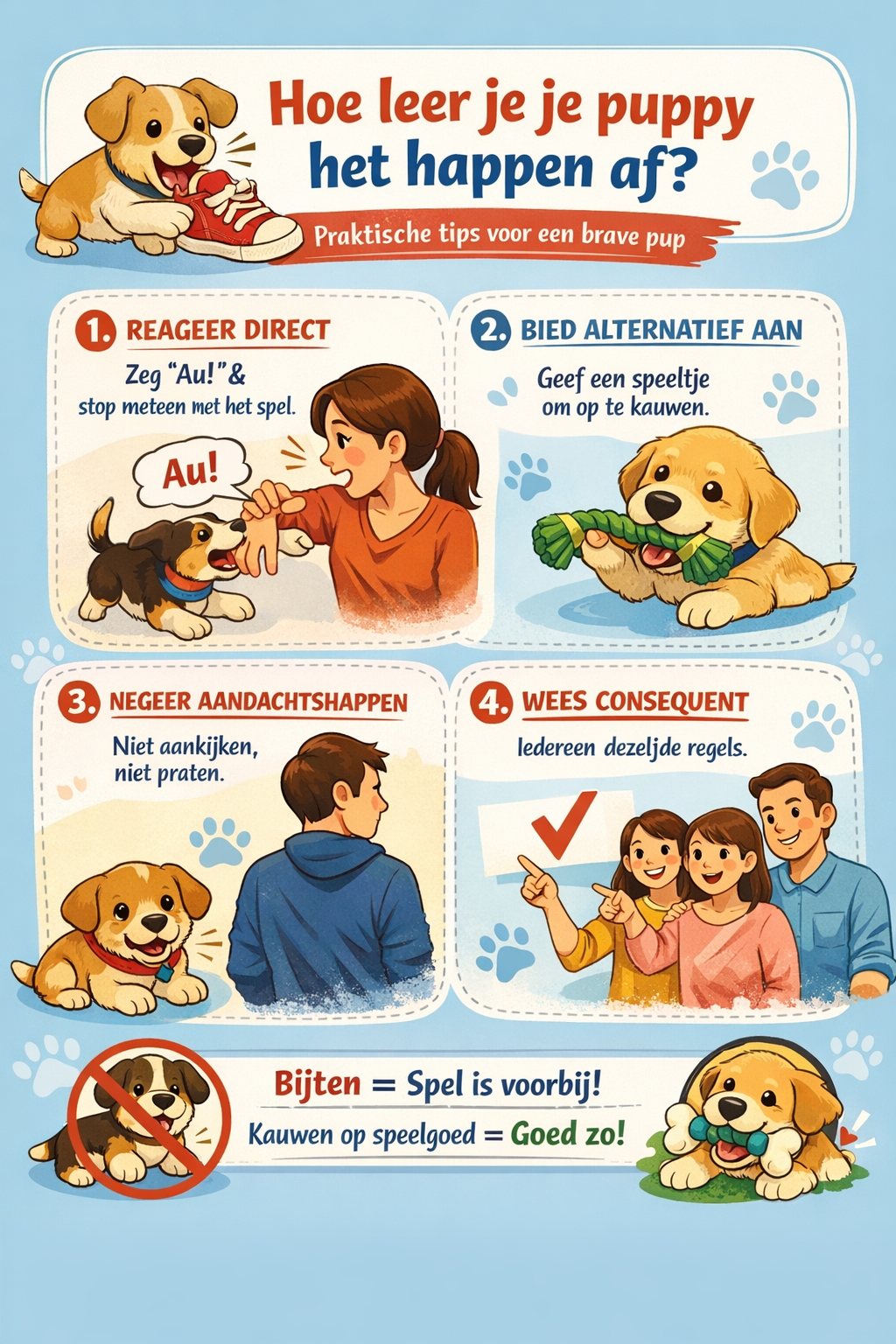 Iedereen in huis moet dezelfde regels volgen. Als de ene persoon wegloopt bij happen en de ander vrolijk doorspeelt, raakt de pup in de war. Hoe consequenter jullie zijn, hoe sneller het gedrag verdwijnt.