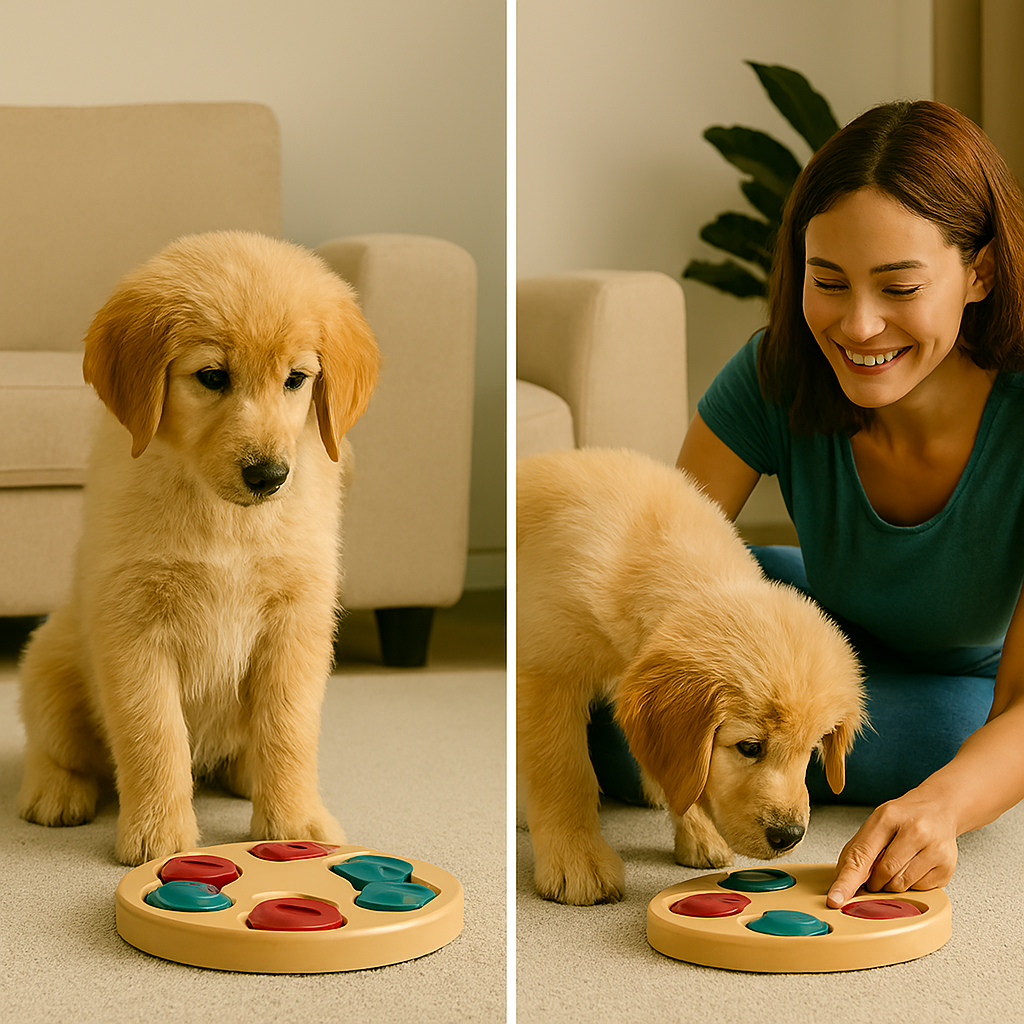 Interactieve puzzels waar je hond eerst iets moet oplossen om een beloning te krijgen houden hem lang bezig en mentaal scherp. Denk aan snuffelmatten of traktatie-dispensers.